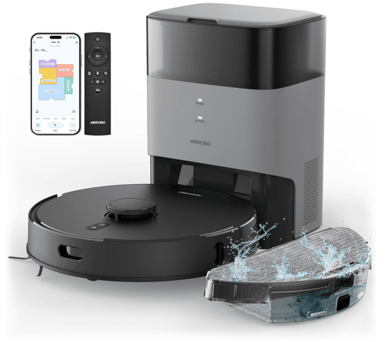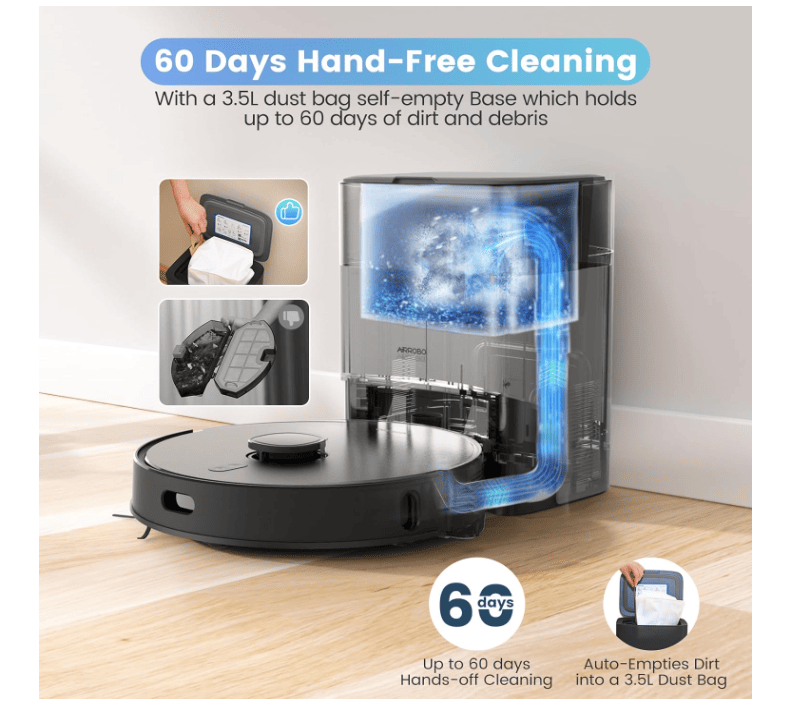3.Hassle-Free Self-Emptying Station: Enjoy up to 60 days of hands-free cleaning. The AIRROBO T20+ self emptying base station is equipped with a 3.5L dust bag capacity. The powerful suction vacuum base station efficiently empties the collected dirt and debris into the dust bag, ensuring uninterrupted cleaning sessions.