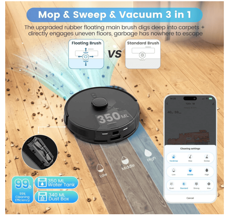 3-in1 feature meets all your needs to keep your space clean with vacuuming, sweeping, and mopping.
