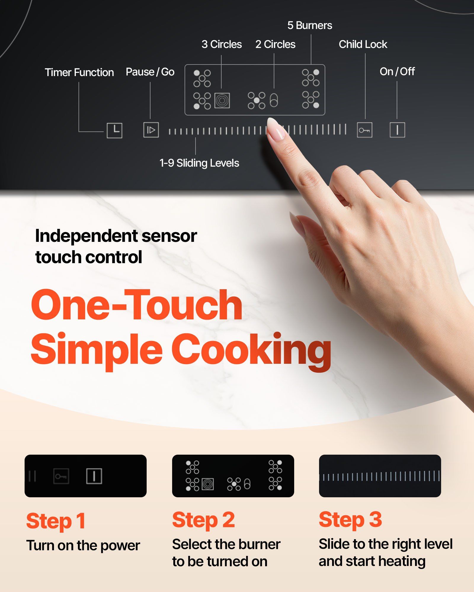 With 5 independent heating burners, our electric cooktop reaches high power output of 8600W. The vertical heat conduction promotes heating efficiency with less heat loss.