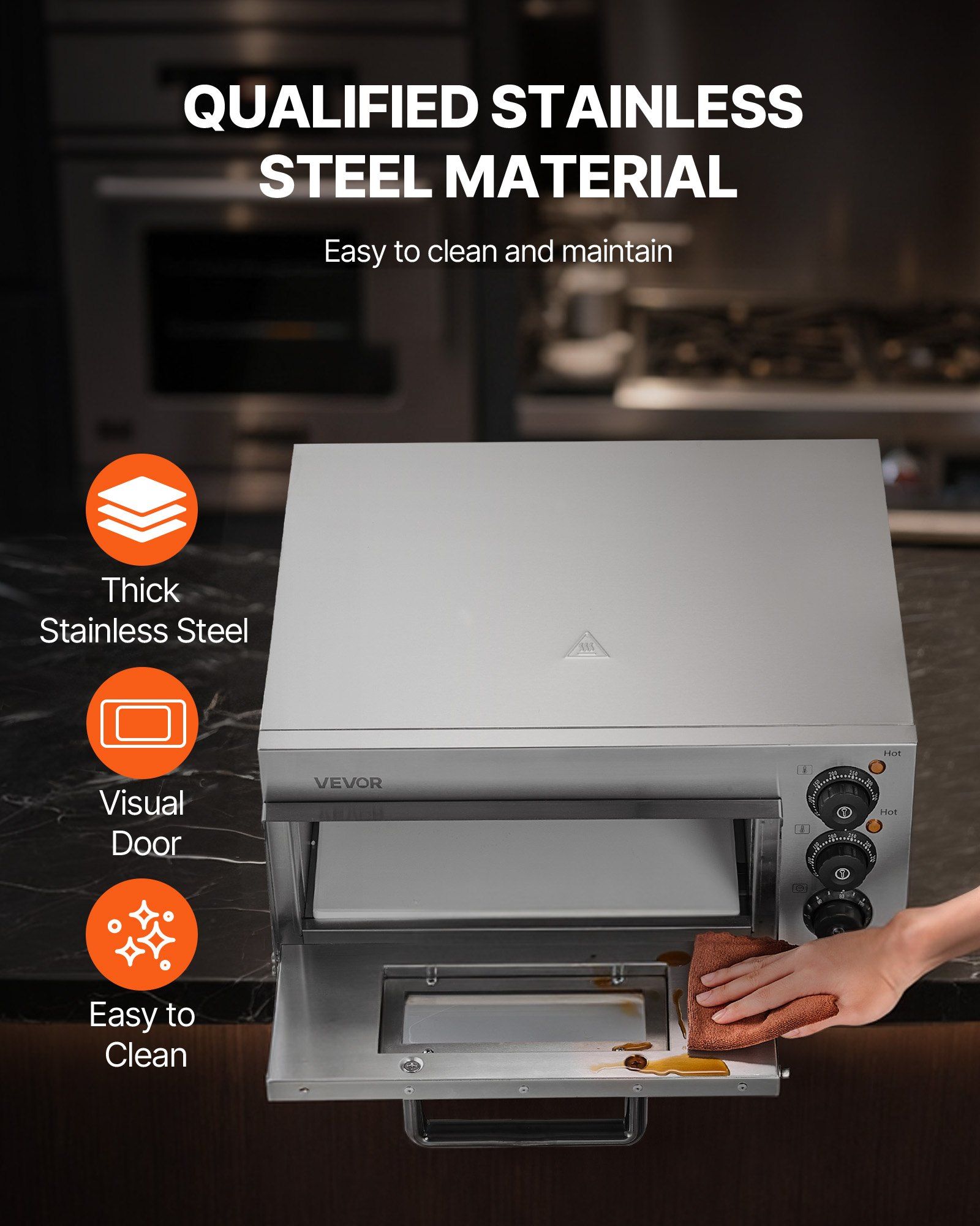 Crafted with food-grade stainless steel, the commercial pizza oven ensures not only durability but also a healthy baking environment. Moreover, the non-stick interior material makes for effortless cleaning and fun cooking.