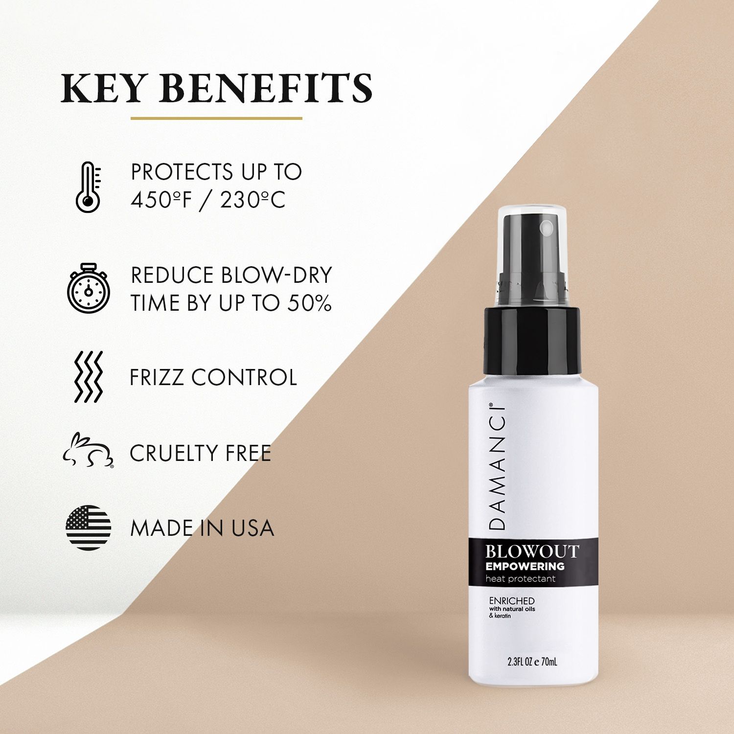 Our premium Blowout Spray is the ideal single product that can both tame your hair and make it look stunning. Made with the highest-quality ingredients, this amazing leave-in conditioner is suitable for all hair types. Curly, thick, straight, frizzy? No worries: DAMANCI Blowout Spray is ready to take on your rebellious hair and make it look gorgeous in virtually half the usual time, with no risk of damage from heat. It is also moisturizing and makes styling much easier, ideal for squeezing some well-deserved haircare into your busy daily routine.