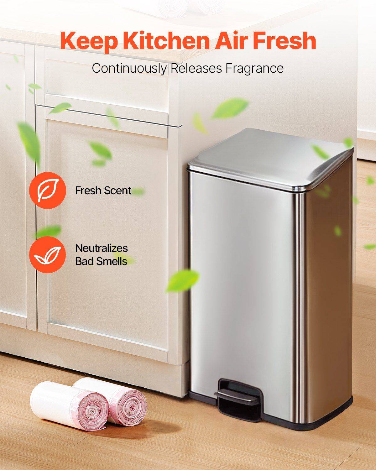 4.Smell Control with Fresh Scent: Once placed in the trash can, these scented trash bags release a light, pleasant fragrance. The scent helps neutralize smells from different types of waste, keeping the surrounding air fresh. The added fragrance contains no harmful chemicals and is completely secure for daily use.