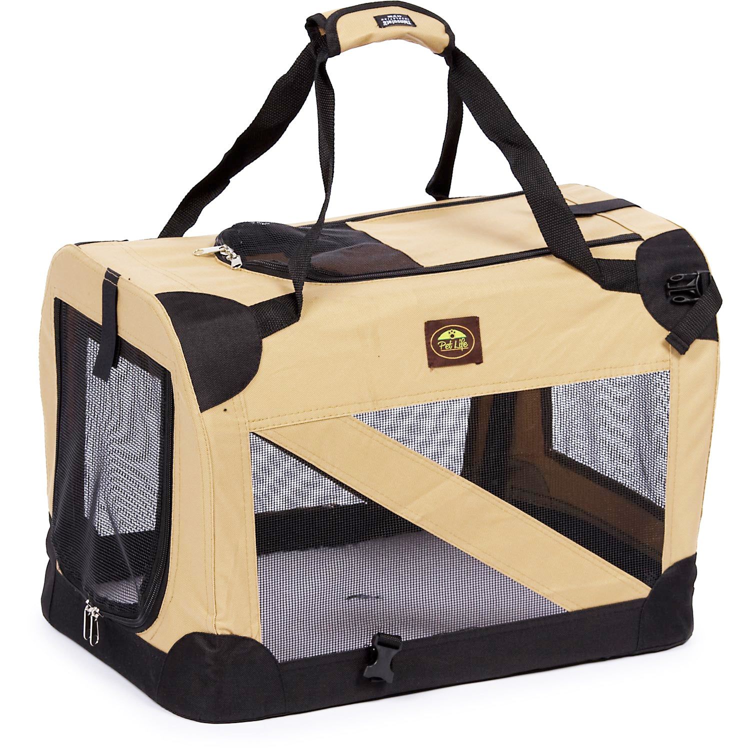 The Pet Life Folding Zippered 360° VISTA VIEW Collapsible Soft Folding Dog Crate Carrier Features a PVC Frame for Added Stability. This Pet Crate mechanically hinges closed and buckles in place. After Folded it can be easily transported around via the Incorporated Side Handle. This Dog Crate Contains Thinsulate Thermal Heat Retention Technology incorporated within the Scratch-Resistant Nylon/Sherpa Padding. Composed of Ballistic Nylon this Pet Crate is Built-To-Last. Included within the inside of the Pet Carrier is a Built-In Leash Holder for added Safety and Protection. Collapses to 4 inches narrow.