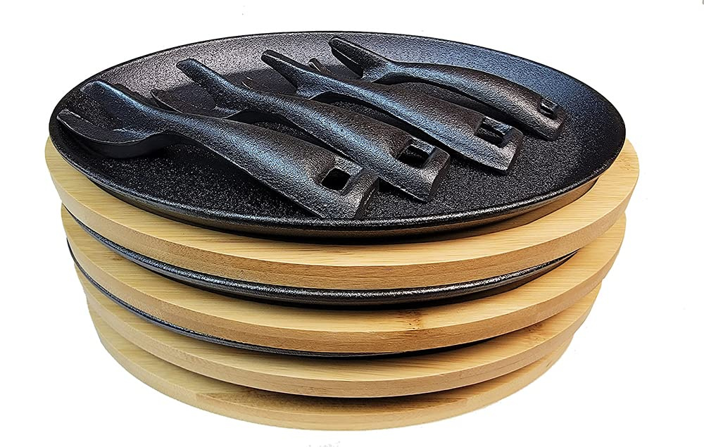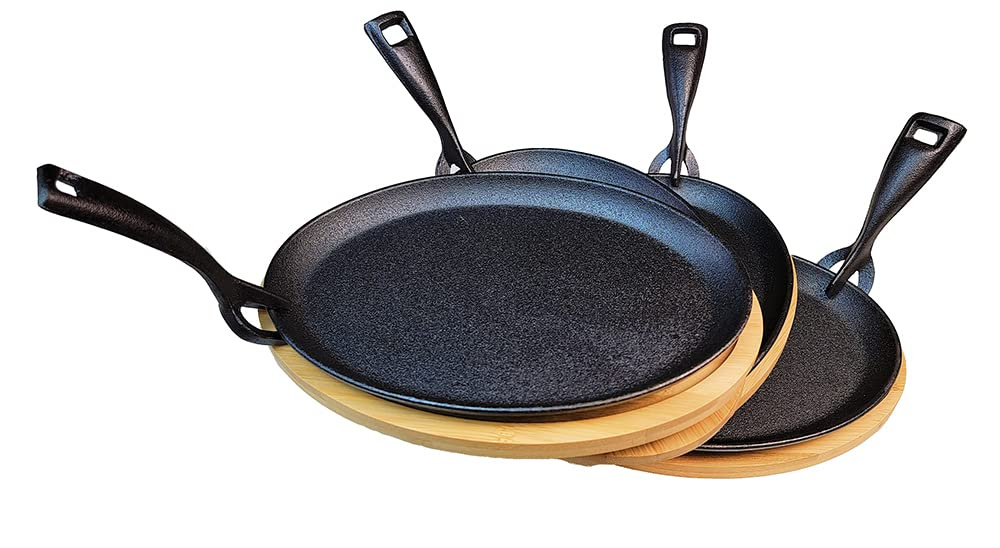 set of 4, cast iron fajiata pan x4, bamboo tray x4, cast iron handle x4.