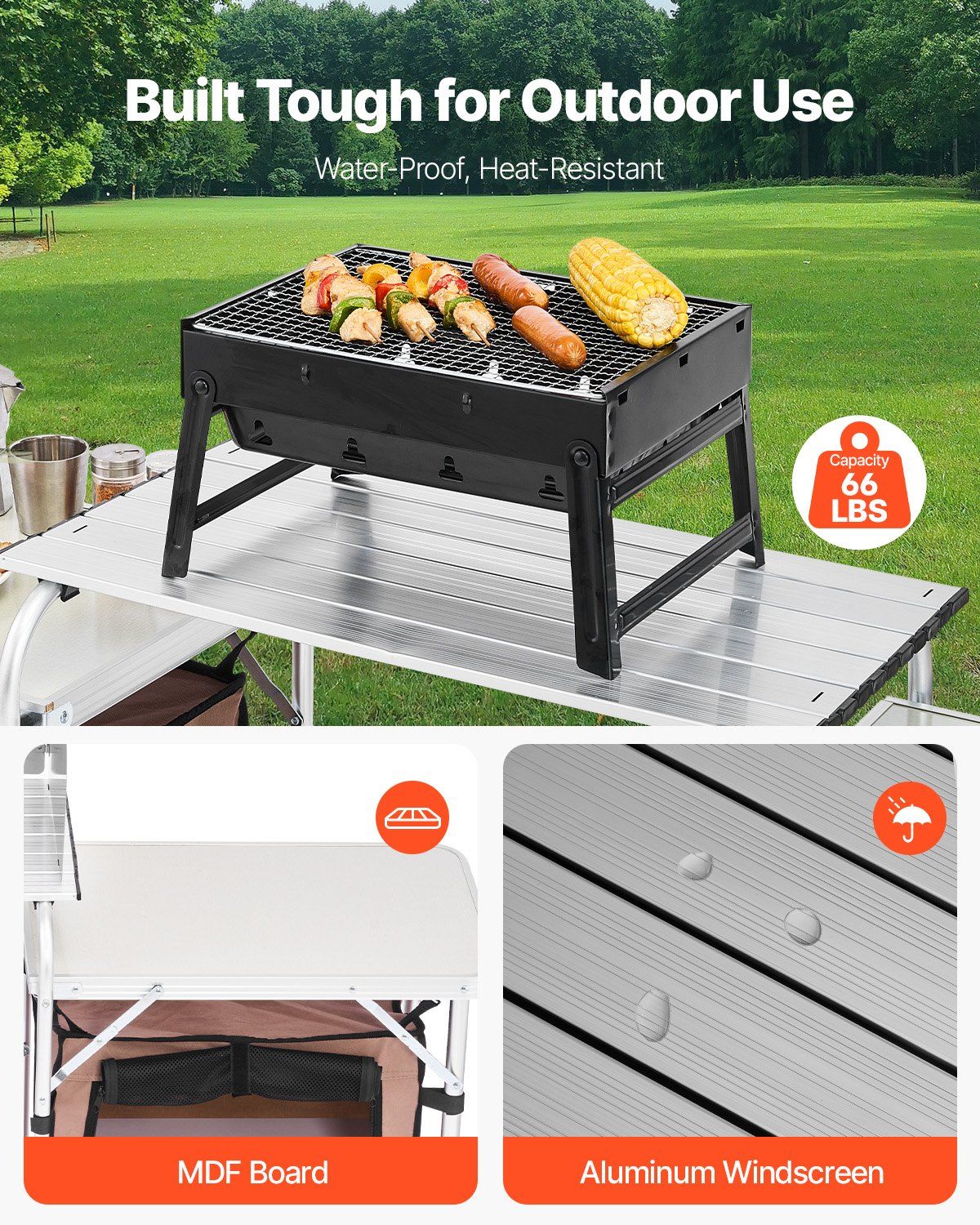 1.Spacious Storage Space: The camp kitchen table comes with a roll-up aluminum tabletop, a windshield and 2 side tables, holding your grills, cooking tools, condiments, and other supplies. The 2-tier detachable storage organizer provides you with extensive space to place utensils in order.