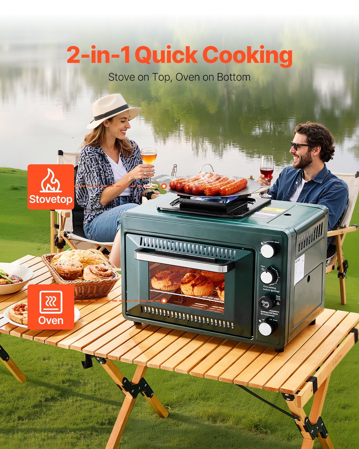 1.2-in-1 Quick Cooking: Our high-performance stove combined with a full-function oven, featuring a stove on top and an oven below. This versatile design saves time and effort for efficient outdoor cooking