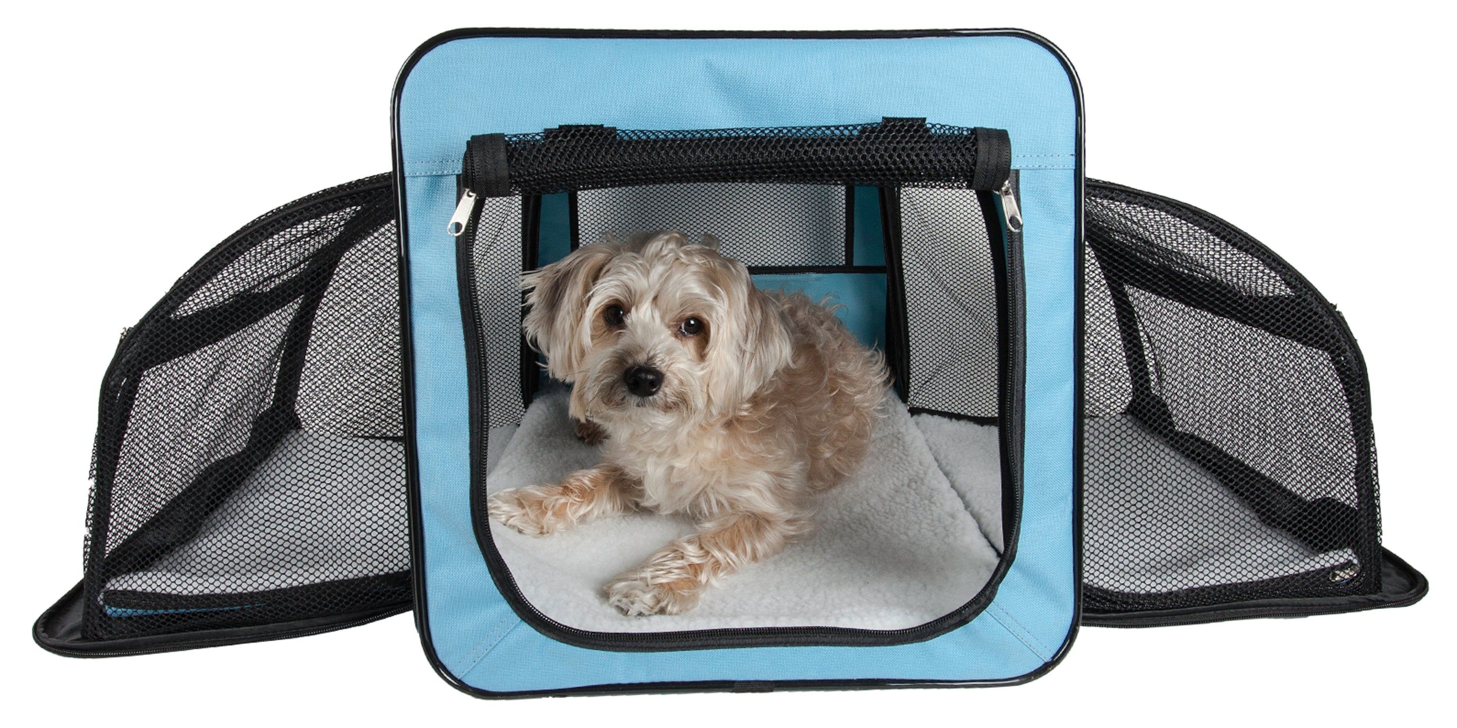 The Pet Life Capacious Expandable wire folding lightweight collapsible crate is composed of heavy-duty Ballistic Nylon and Mesh with bendable yet sturdy built-in flexible extenders that Velcro into place and hold up the 2 outer mesh expandable sides. Fully expands on both sides and collapses and folds. Perfect for multiple pets. Lightweight and great for traveling and indoor or outdoor usages. Features a spacious frontal breathable mesh entrance that rolls up and Velcro's into place, great for added sunlight visibility and exposure when opened with a back mesh window. Features dual reinforced stitching for added durability. Comes with an included reversible plush inner cushion that extends to cover the full surface area. Available in Multiple Colors and Sizes.