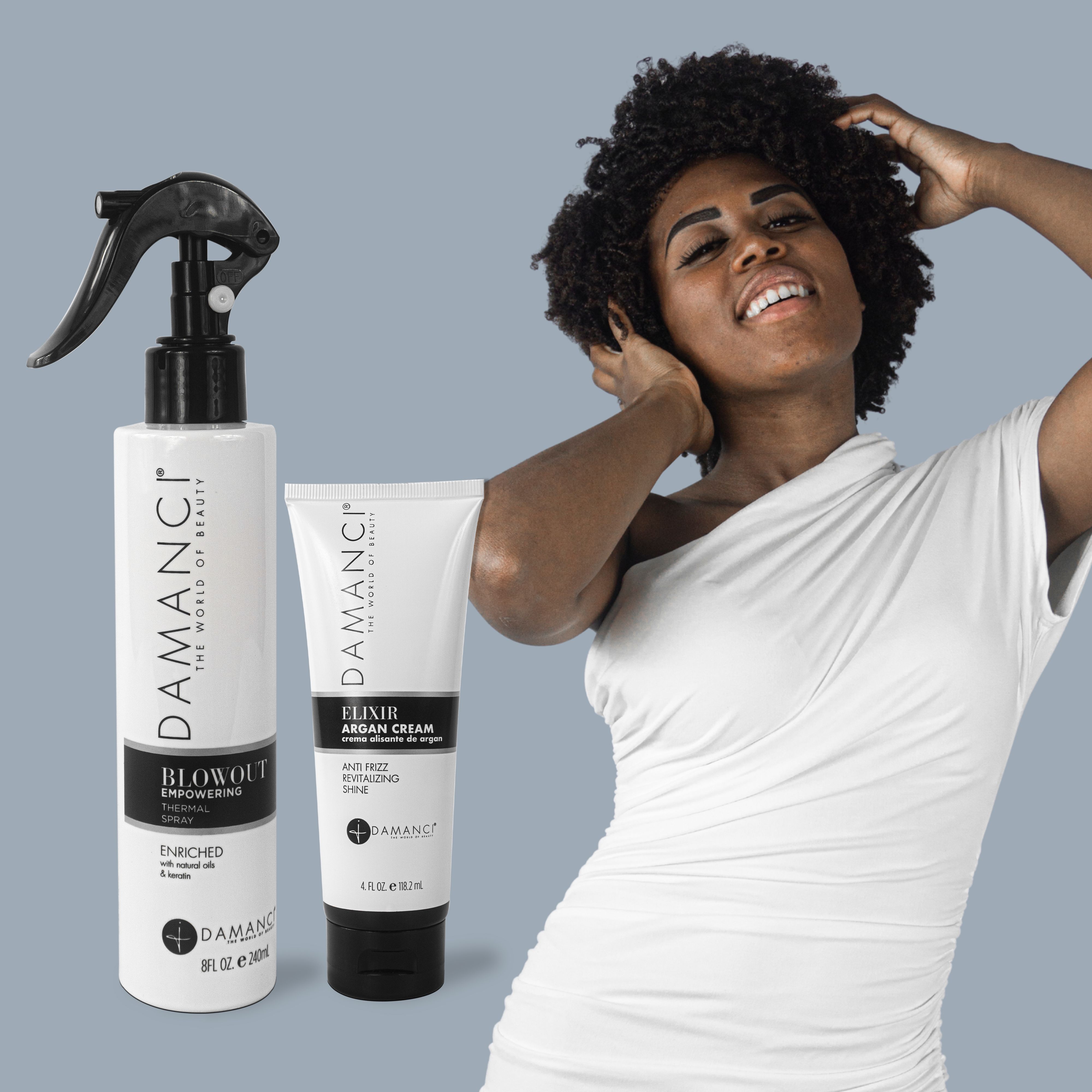 Damanci’s Elixir Argan Cream and Empowering Blowout Spray make up the ultimate leave-in moisturizing cream and heat protectant combination. Perfect for that holiday weekend away from home, when you need to keep your hair at its best with minimum effort.