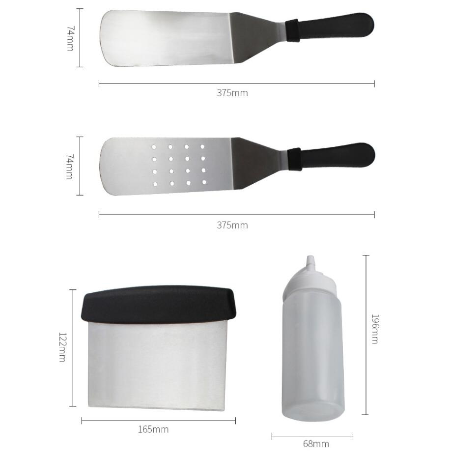2.Curved or slanted edges which make the griddle tools easier to use, ergonomic handle of each tools for the best griddle experience.