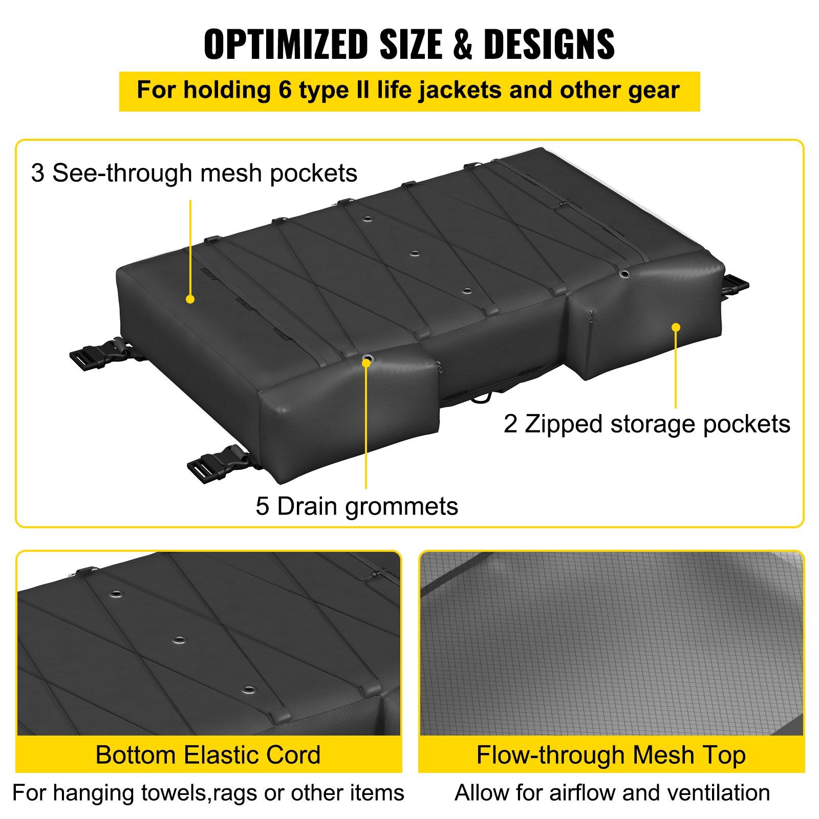 4.Extra Ample Storage Capacity: The main compartment with a nylon zipper can hold 6 life jackets, and a stretch cord across the bottom is for hanging towels, rain gear, or other items. Besides, the top of the storage bag is ventilated due to a nylon mesh for promoting airflow. The front side has 2 extra pockets and 3 mesh pockets for storing small items.