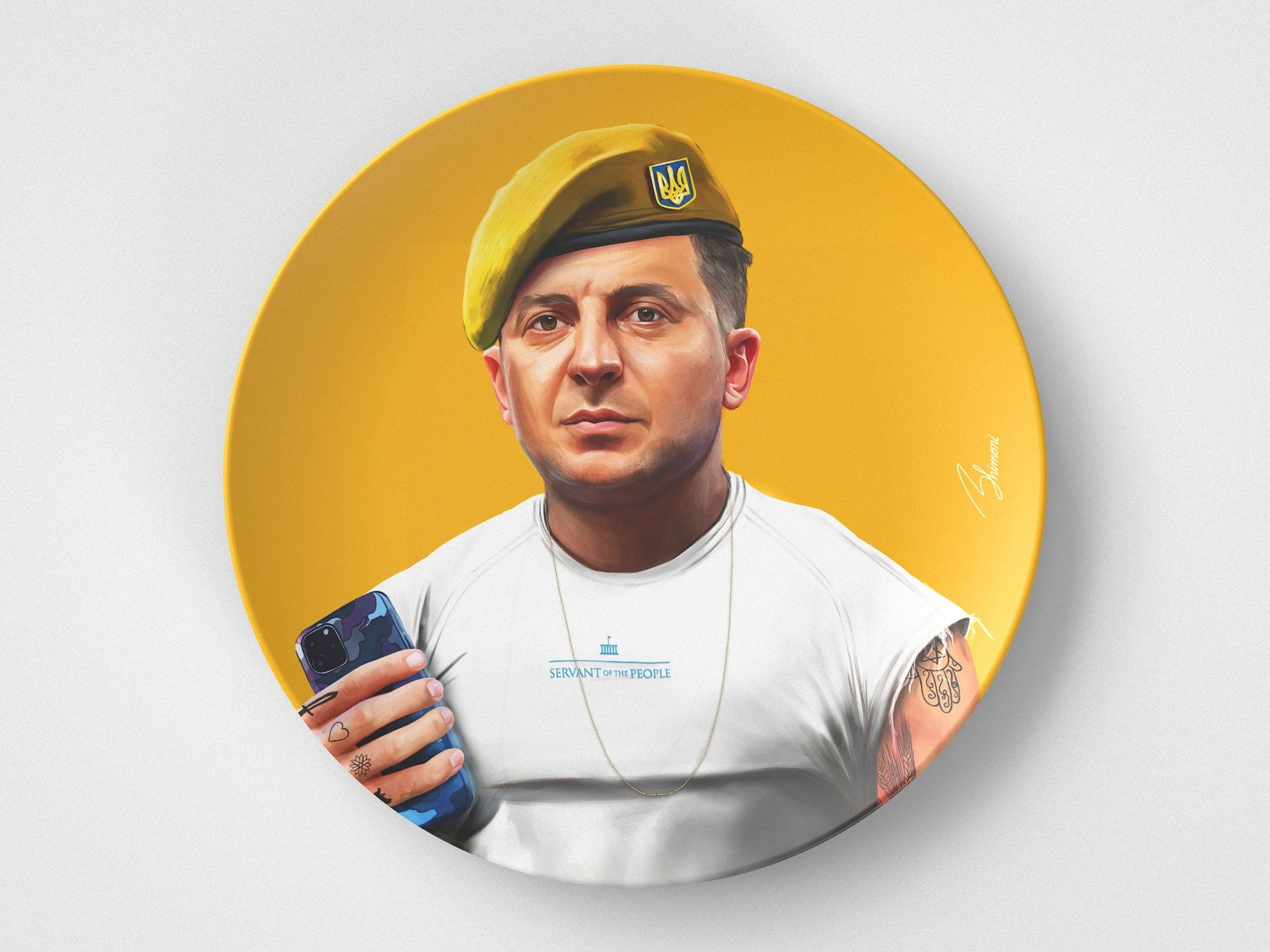 "Even if there is no electricity, the light of our faith in ourselves will not be put out."Volodymyr ZelenskyThis unique 10" DecoWare® plate portrays Volodymyr Zelensky in a modern light, sporting a beret and a smartphone, symbolizing his dynamic approach to leadership. This plate is a statement piece reflecting resilience and contemporary statesmanship. P R O D U C T D E T A I L S // 10" Round Dinner Plate, 0.75" Tall// Microwave safe// Oven-safe up to 250 degrees Fahrenheit for 1 hour// Dishwasher-safe// Molded from DecoWare® - a high performance medical-grade polymer// Safe for food contact// Contains no melamine, BPA's, formaldehyde or other harmful chemicals// Recyclable// 100% Made in the U.S.A.// Durable satin finish// Unbreakable with normal use F I N E P R I N T Due to the many variations in monitors, the actual colors on each plate and platter may appear slightly different than the colors that appear on your monitor. They are awesome in real life!Each unique Plate is made to order. S H I P P I N G T I M E S Please allow 5-7 business days for your package to arrive via USPS. If your order has not arrived by the 7th business day, please contact us so we can resolve the issue. Most orders arrive to our customers within 3-7 days of placing the order, but we are unable to guarantee this fast delivery due to production and shipping times that are outside of our control. R E T U R N S & R E F U N D S Returns and exchanges are accepted within 14 days of delivery. If there are any problems with your order, please feel free to message me and I will help any way possible. W E L O V E O U R C U S T O M E R S Thank you so much for browsing our listings, don't hesitate to message with any questions or concerns. We strive to please you!