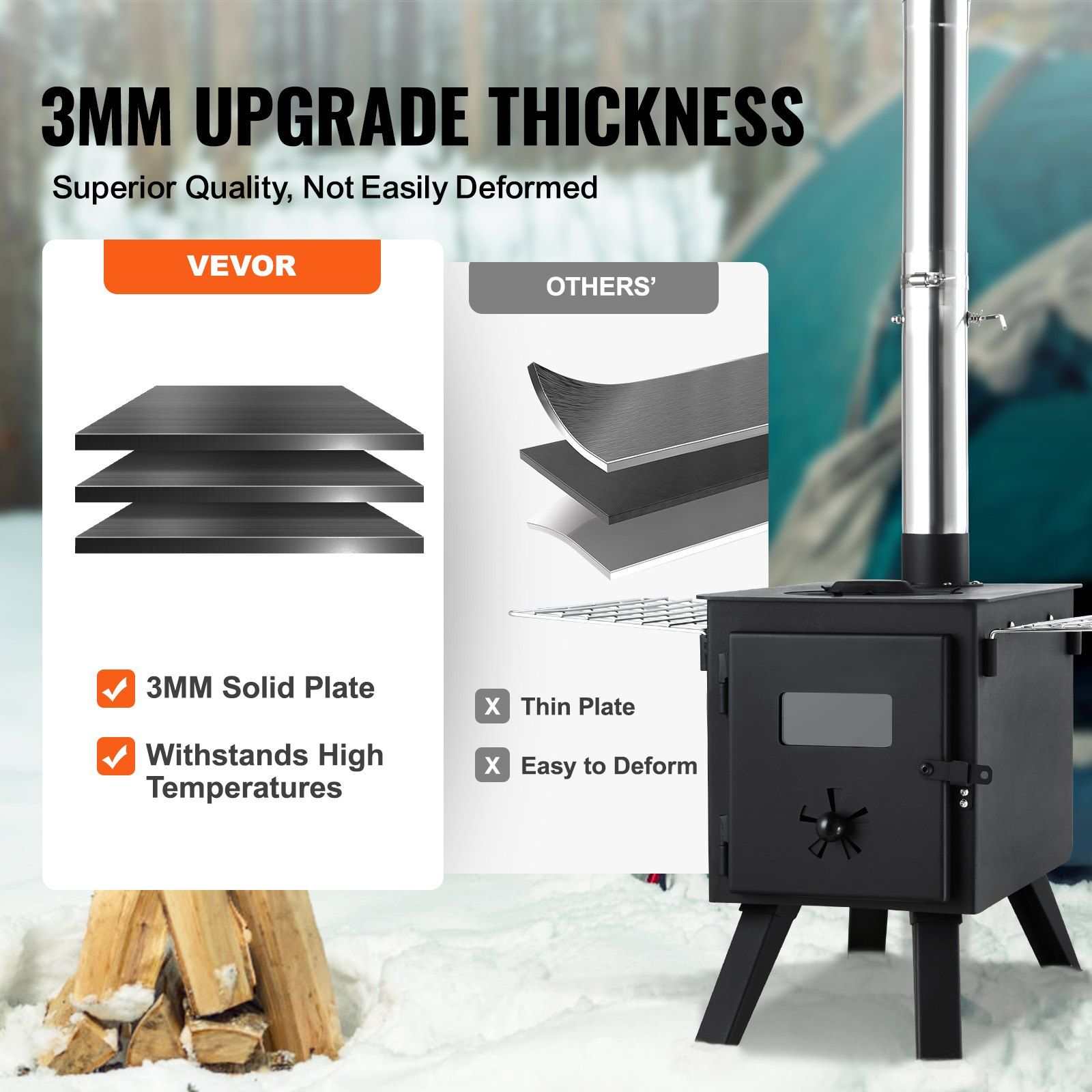 4.3 mm Reinforced Panels: Crafted with rust-resistant stainless steel, our wood burning stove can withstand high temperatures and rough outdoor conditions. The 3 mm / 0.12"" thick panels prevent deformation even when carrying heavy objects, ensuring durability and longevity.